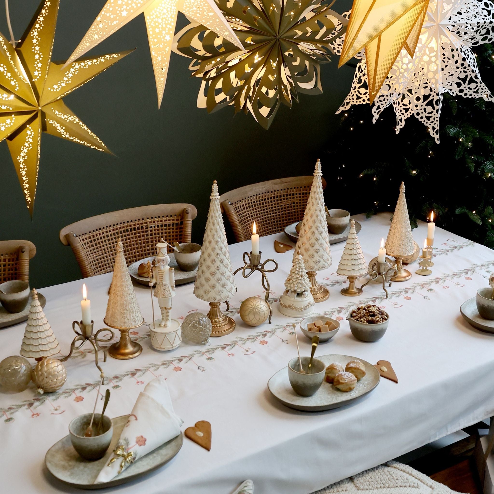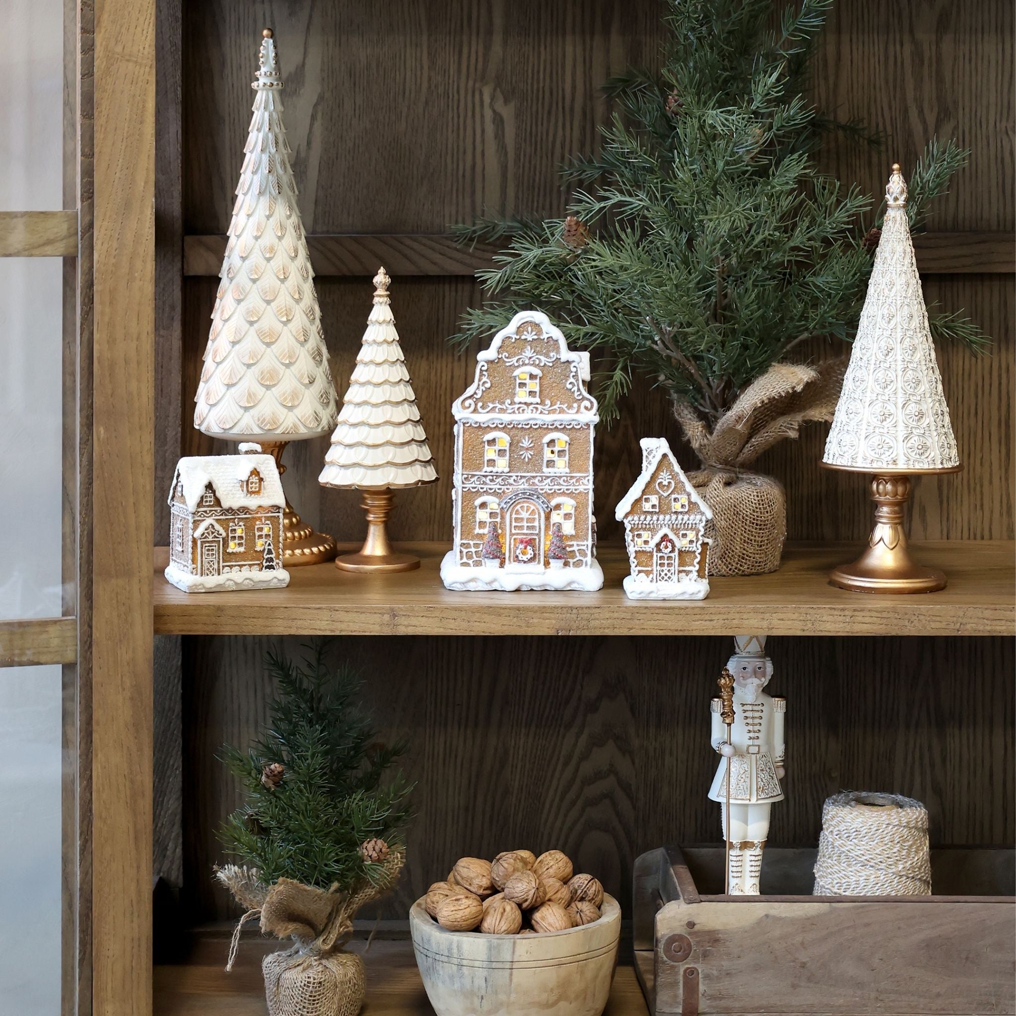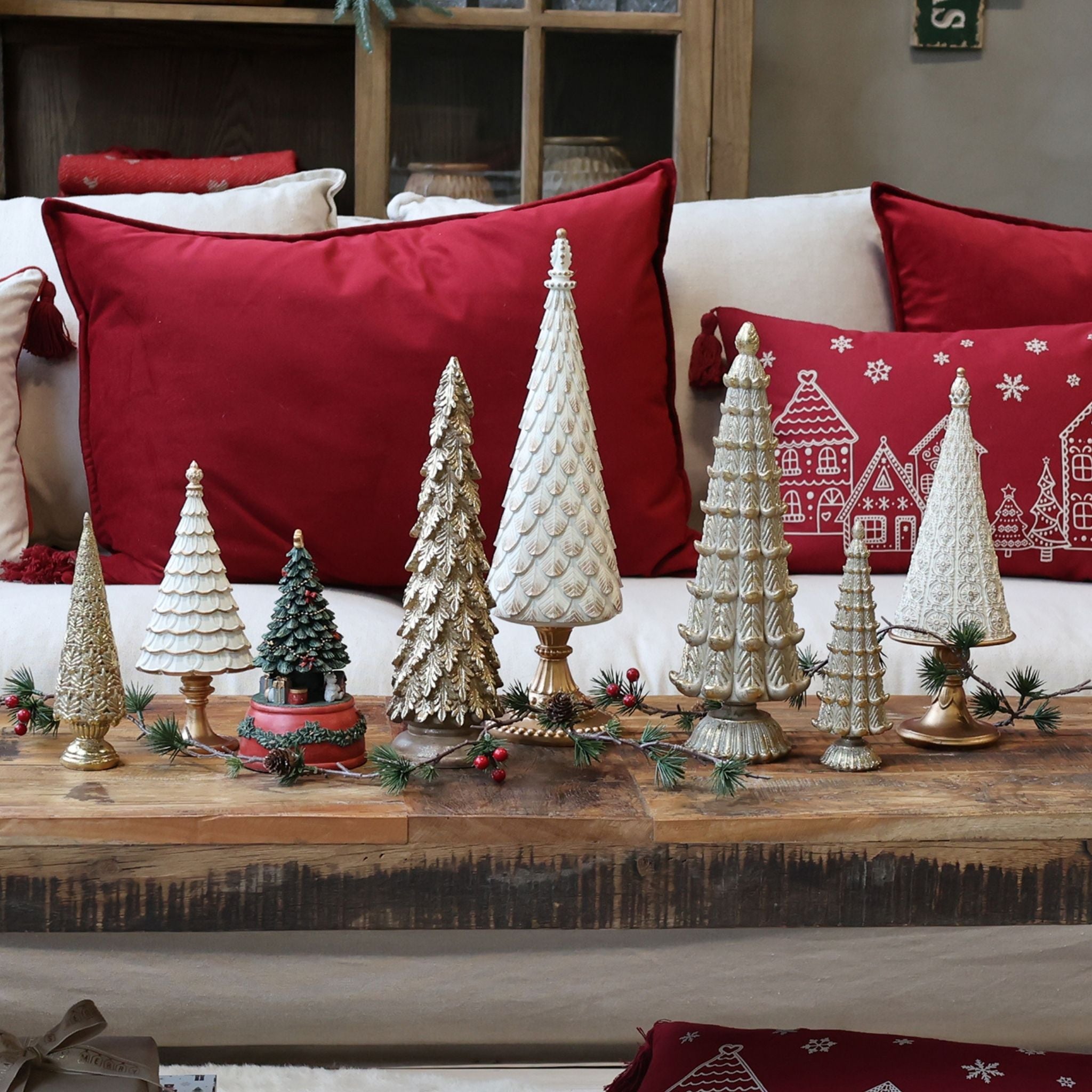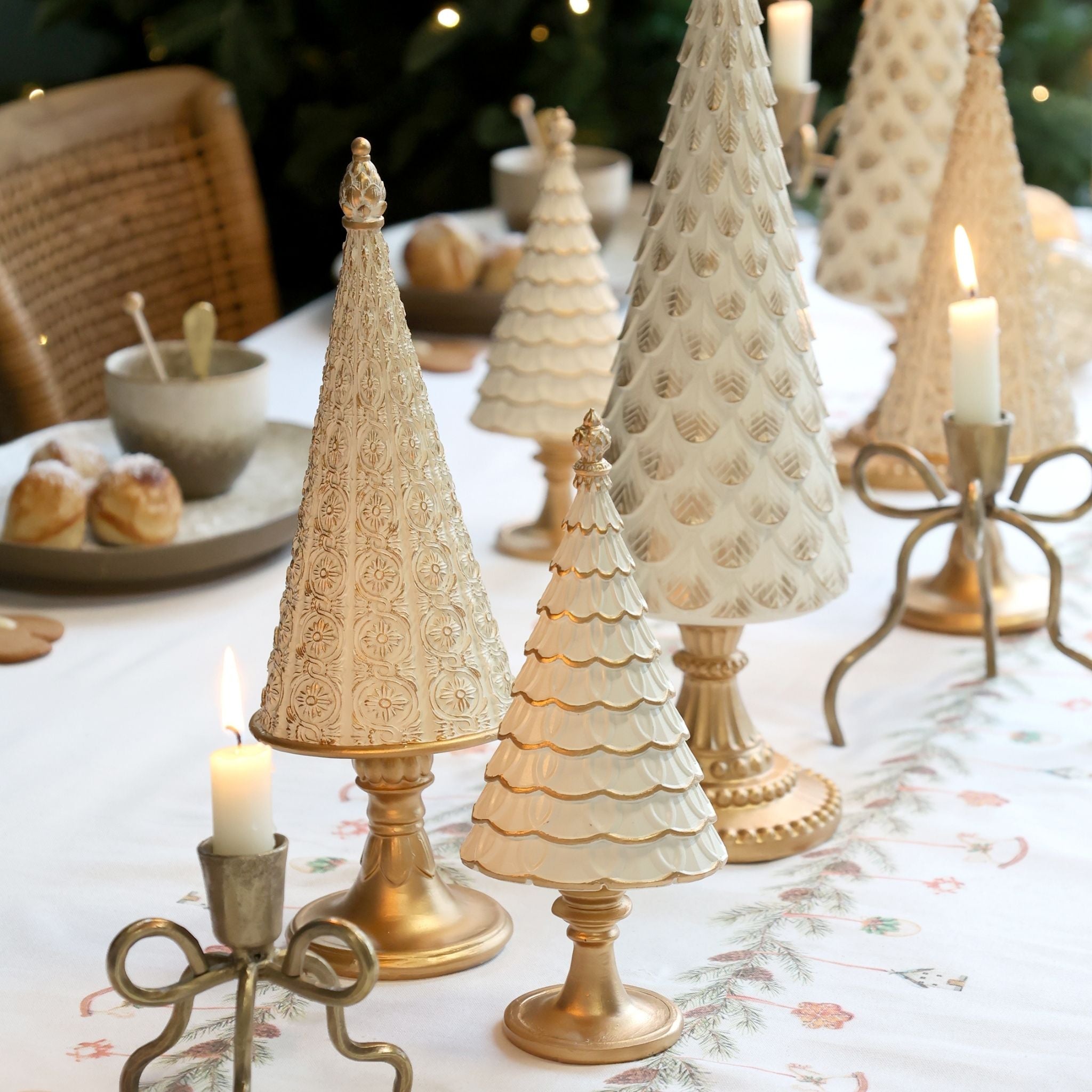 Skønne pyntejuletræer i farverne antique creme og guld. Juletræerne kommer i forskellige størrelser og har forskellige designs. Du kan både pynte med dem enkeltvis eller sætte flere forskellige sammen til en større juledekoration.