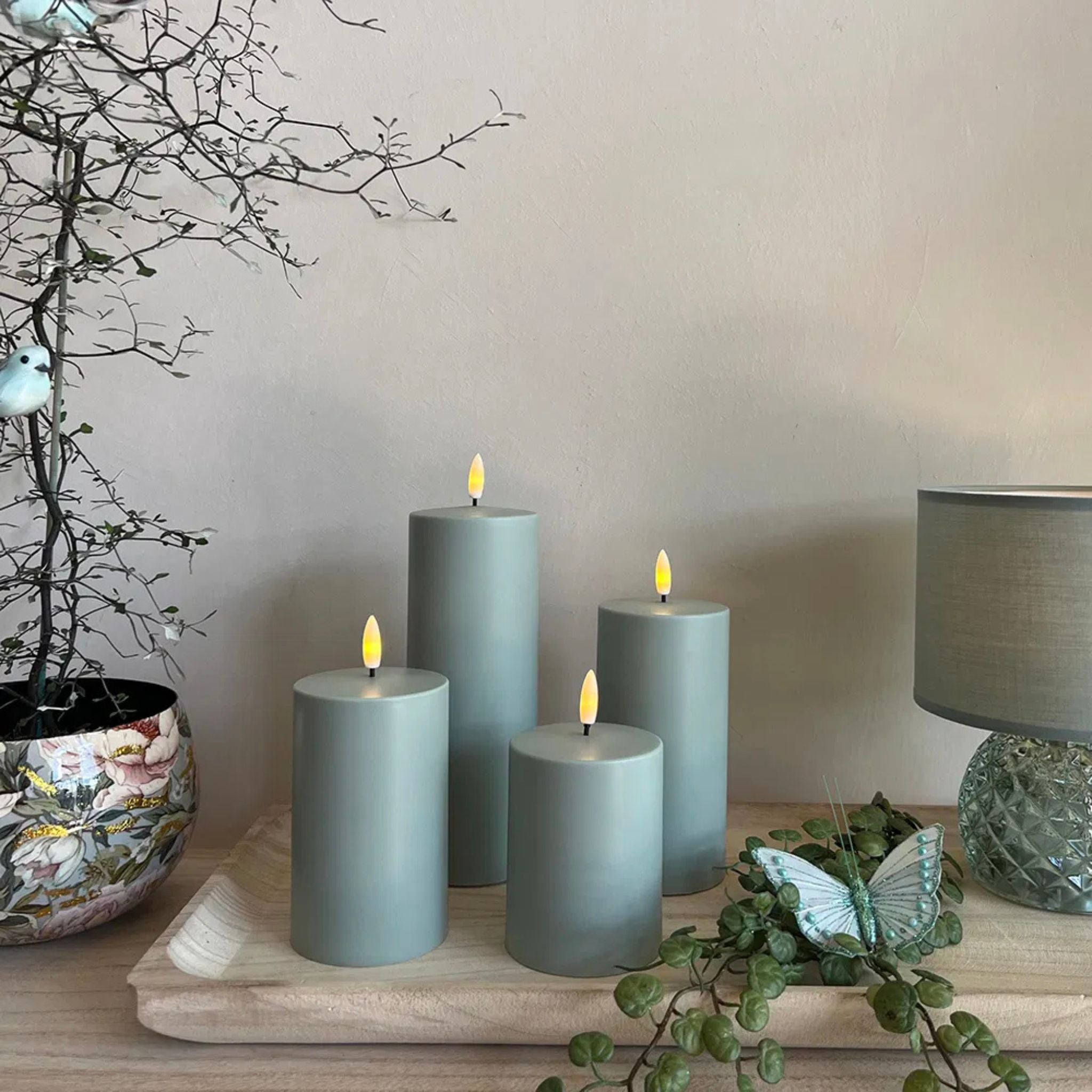 Kombinieren Sie die Kerzen mit einer schönen Laterne oder stellen Sie sie auf ein dekoratives Tablett.