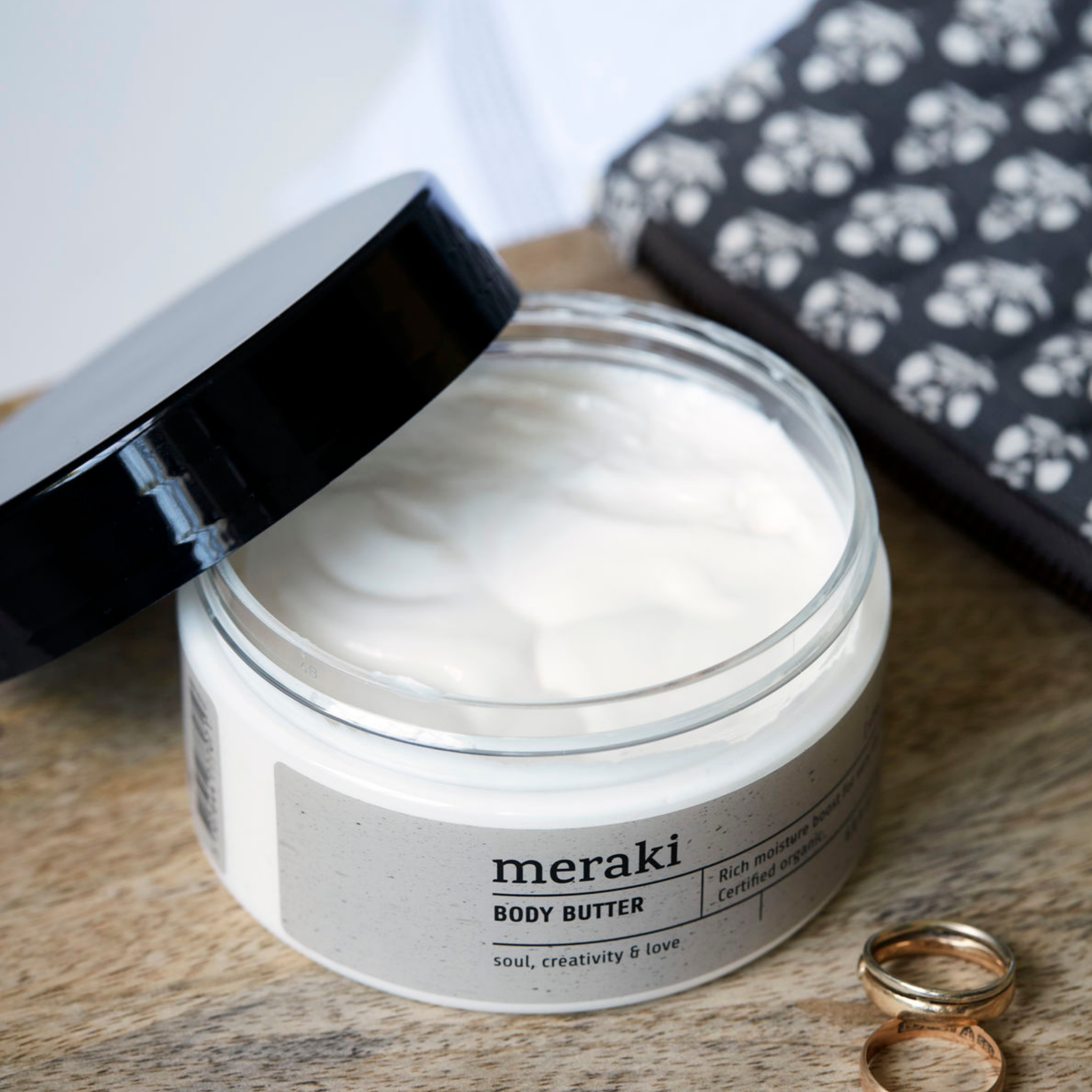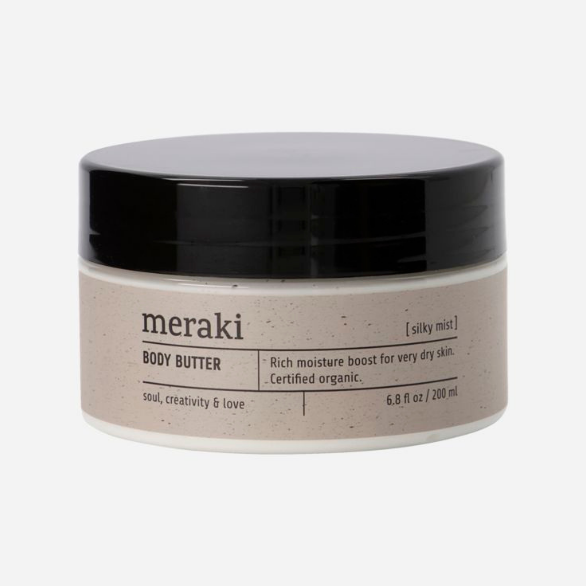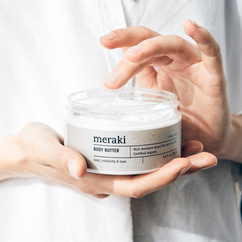 Diese zertifizierte Bio-Körperbutter von Meraki macht Ihre Haut weich und geschmeidig, ohne sie fettig zu machen. Aloe Vera, Sheabutter und eine Reihe pflegender Öle aus Mandel, Sonnenblume und Olive beruhigen und spenden Ihrer trockenen Haut Feuchtigkeit. Die pflegende Körperbutter kommt mit dem Duft Silky Mist, der Noten von weißen Zitrusblüten aufweist. Massieren Sie eine angemessene Menge Körperbutter sanft in die trockene und saubere Haut ein. Wird nach Bedarf verwendet. Zertifiziertes COSMOS-Bio-Produkt von Ecocert.