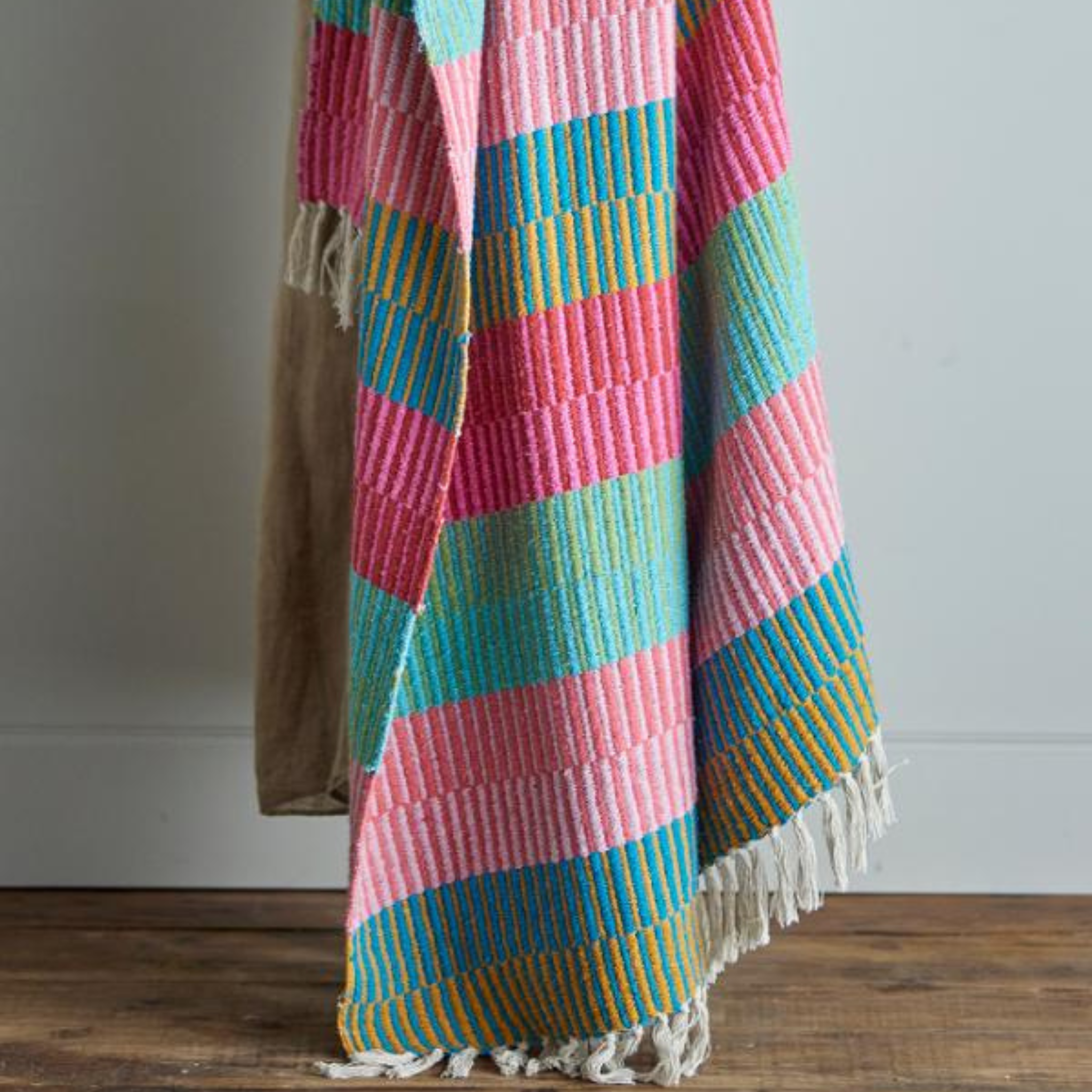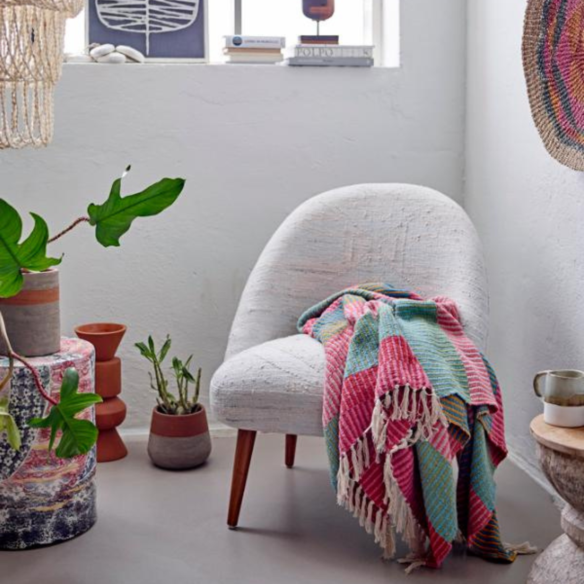 Plaiden er lavet af genbrugsbomuld, hvilket gør at den ikke kun er dekorativ, men også et bæredygtigt valg, der bringer både varme og miljøbevidsthed ind i dit hjem.