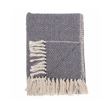 Blød og dekorativ plaid lavet af genanvendt bomuld og vævet i et fint mønster i en nordisk dybblå farve.