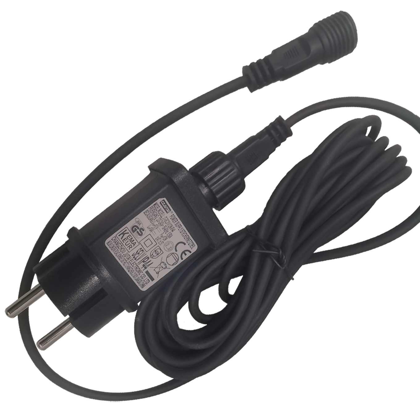 Transformator er IP44 godkendt, så det kan bruges udenfor. Har et 5 meter langt gummikabel.