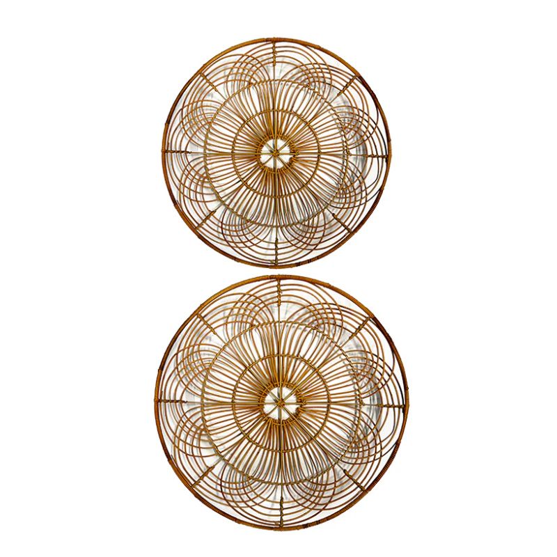 I sætter finder du to stk runde vægdekorationer. Den mindste har størrelsen Ø57 cm med en dybde på 8,5 cm og den største Ø63 cm med en dybde på 8,5 cm.