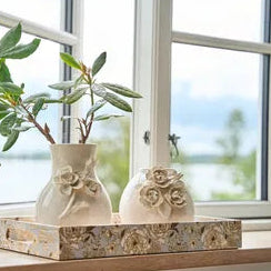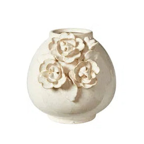Smuk og dekorativ vase med blomster i beige. Vasen er påsat håndfoldet blomster og kommer med filt dutter.