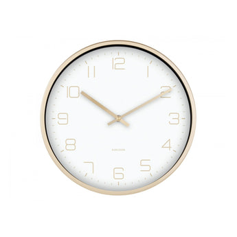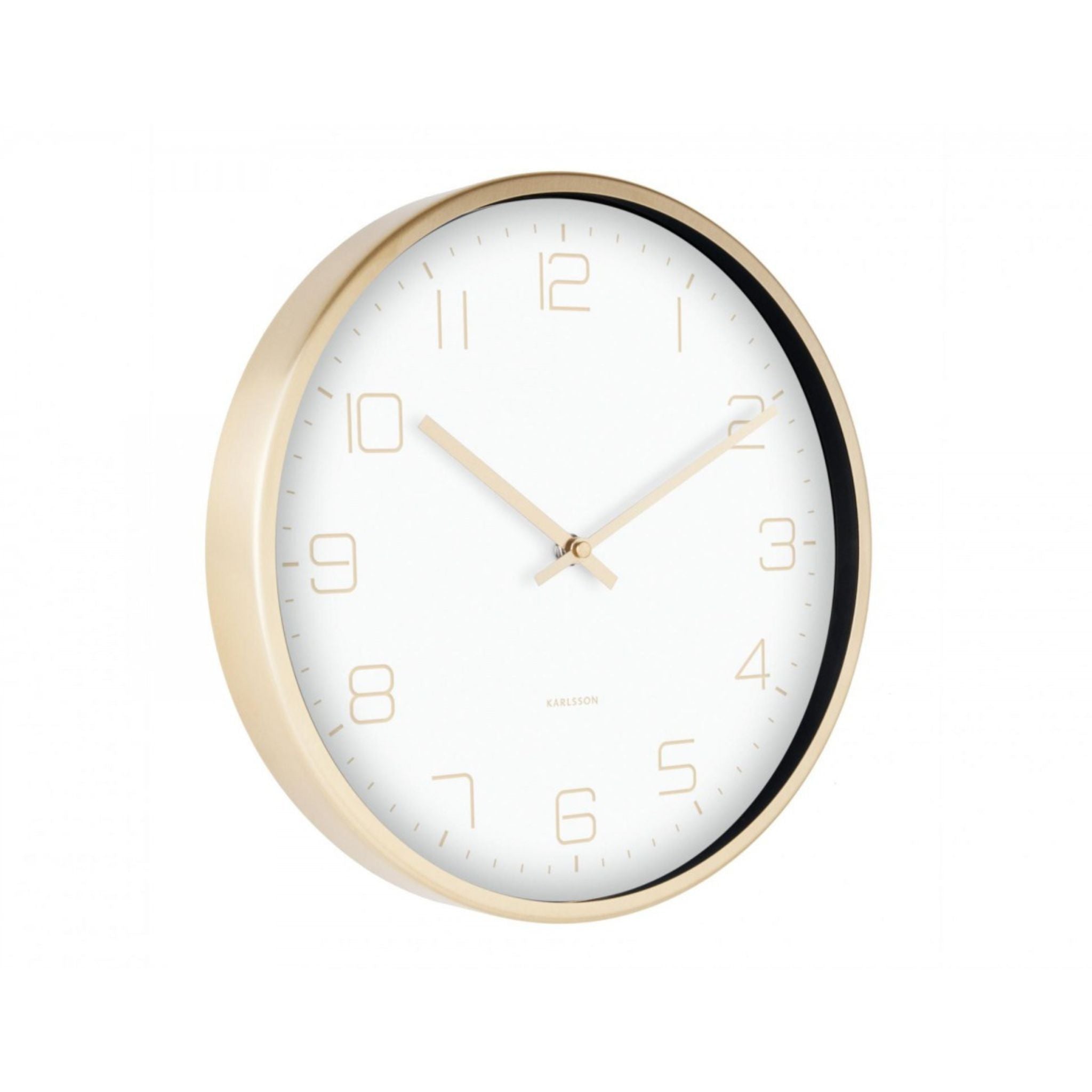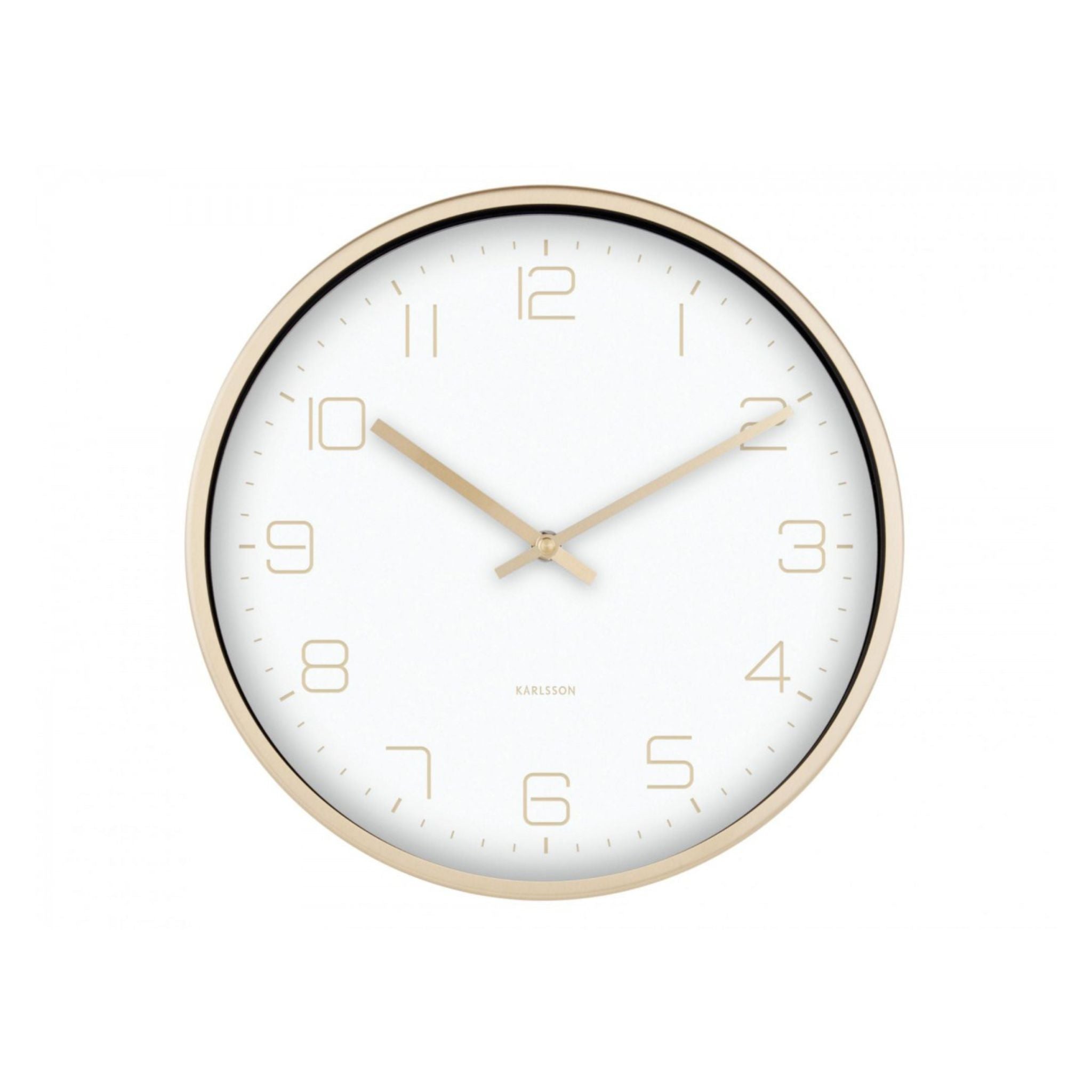 Diese wunderschöne Wanduhr von Karlsson vereint Schlichtheit und Eleganz in einem zeitlosen Design. Die Uhr hat ein weißes Zifferblatt mit dezenten Zahlen und Zeigern in passendem Gold-Finish, das den schönen Rahmen der Uhr aufgreift.